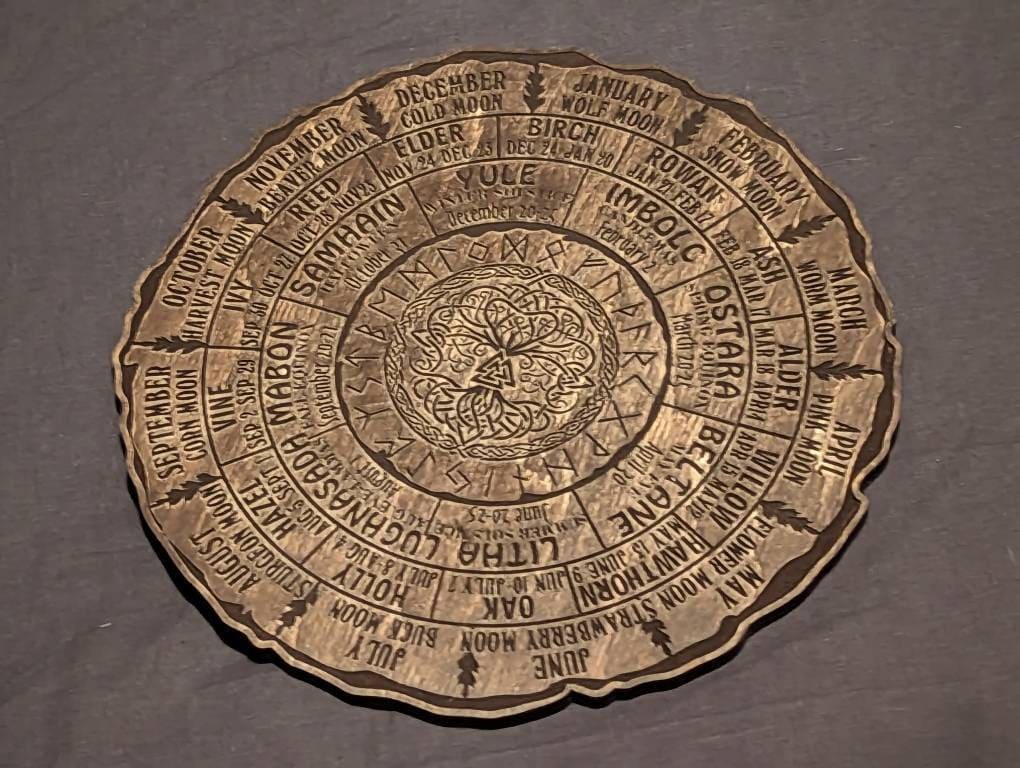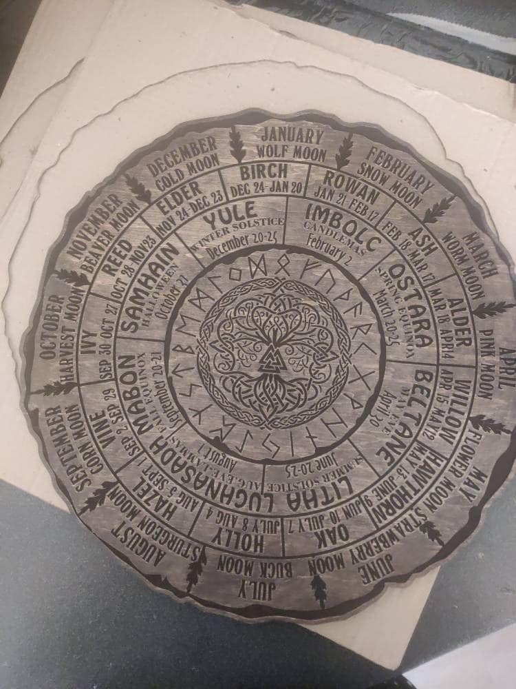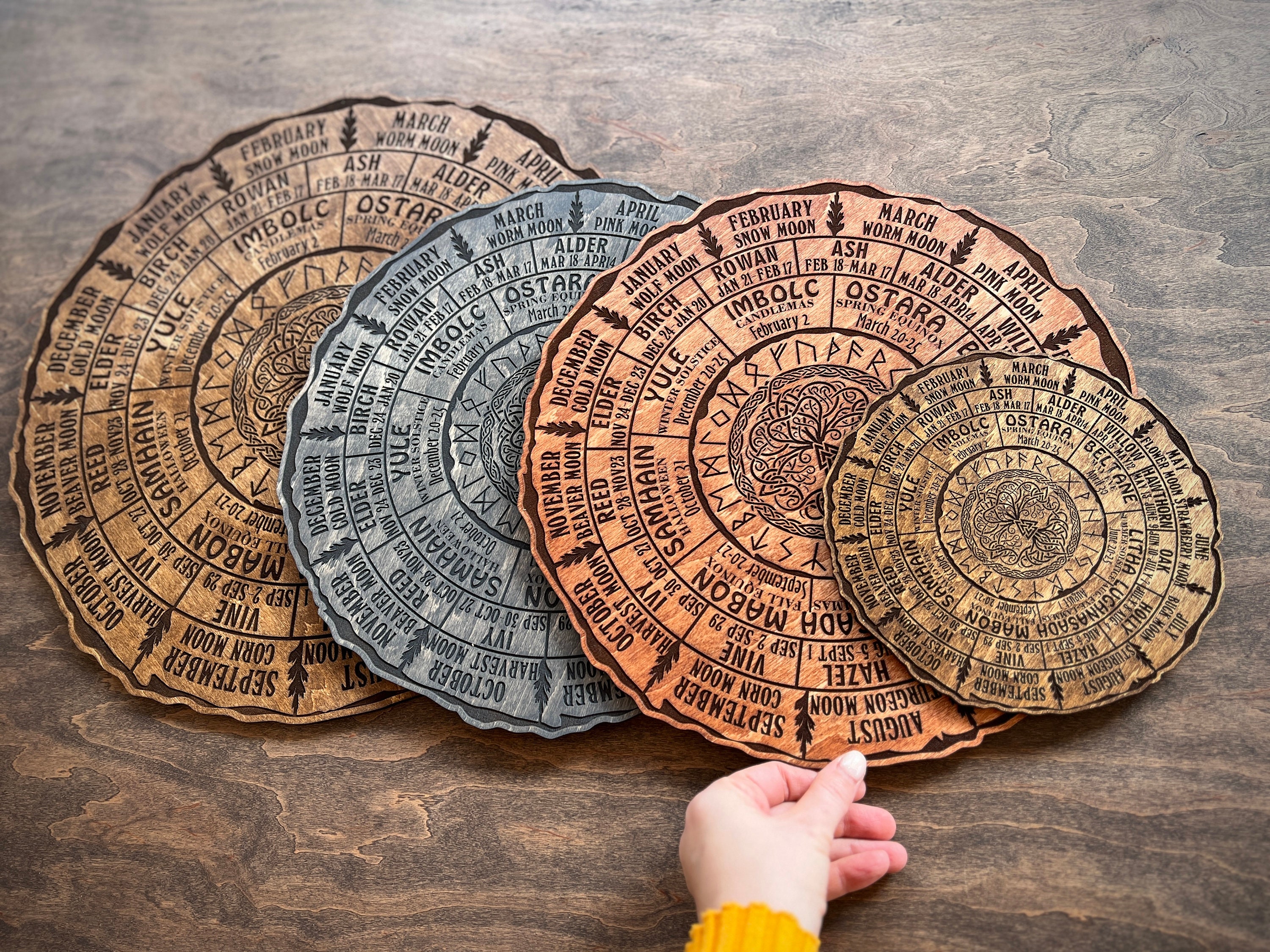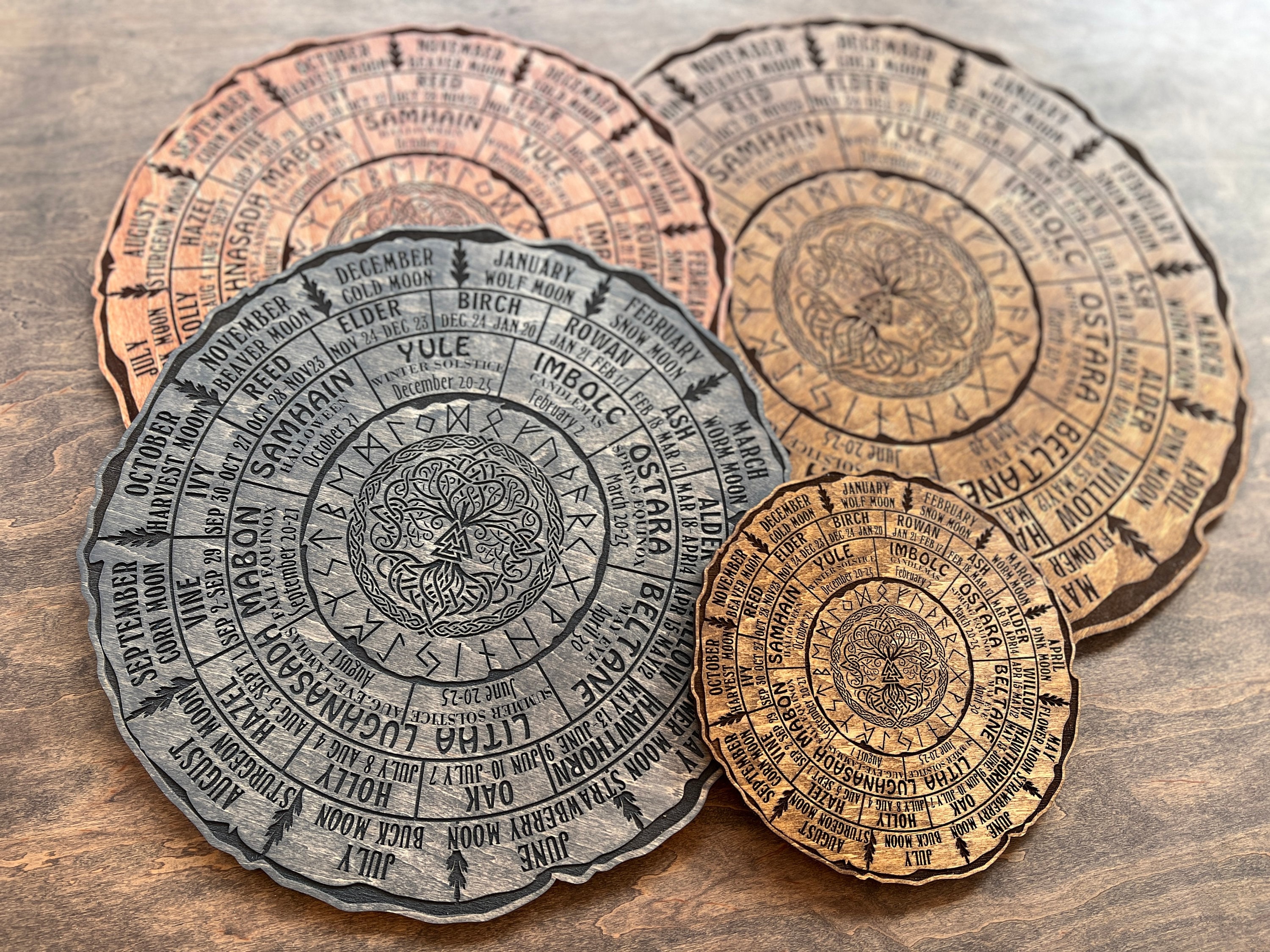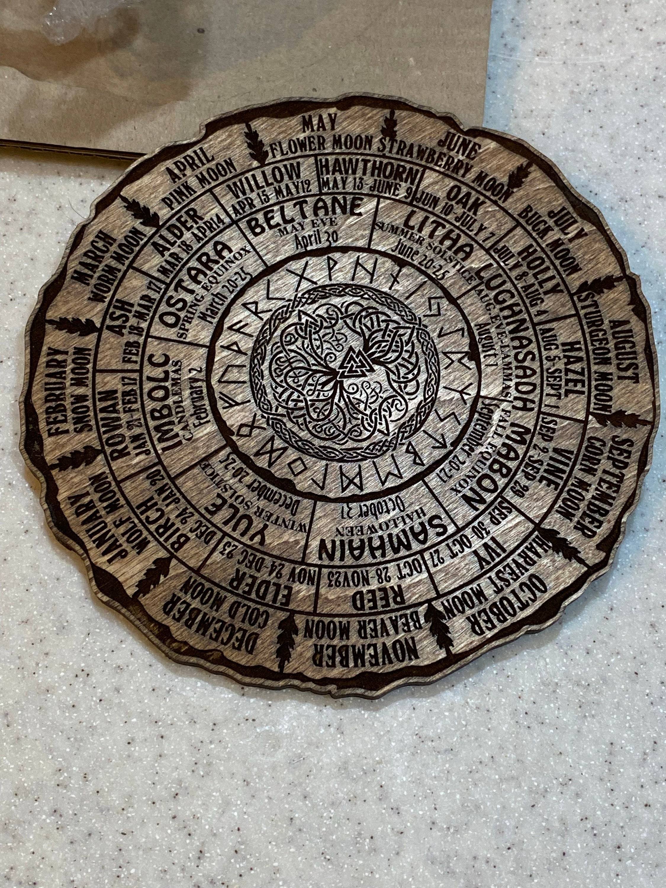 Beautiful laser engraved Wheel of the Year is made of 1/4-inch-thick Birch plywood and comes in different sizes and colors.