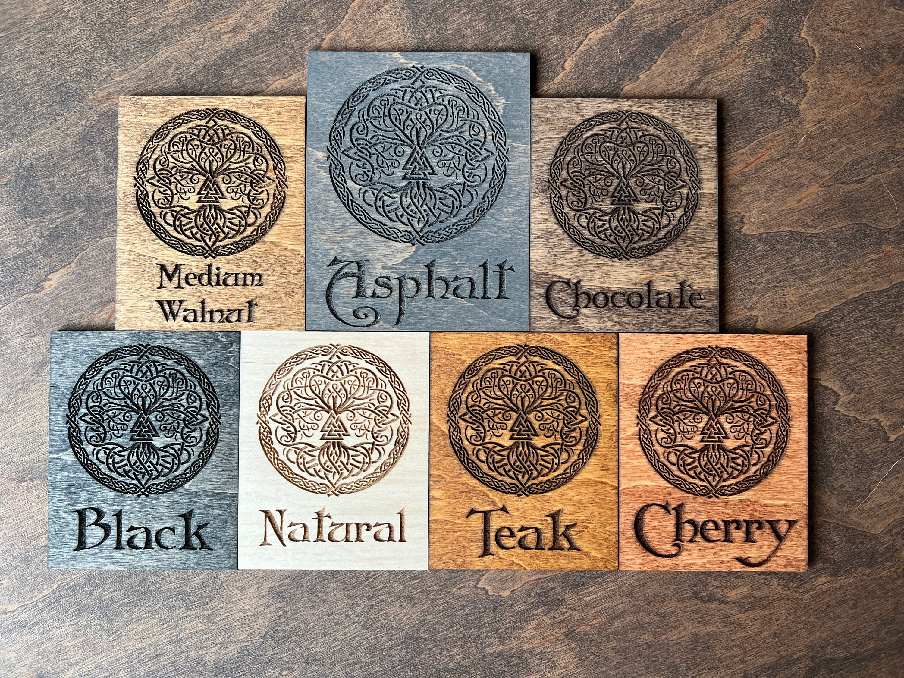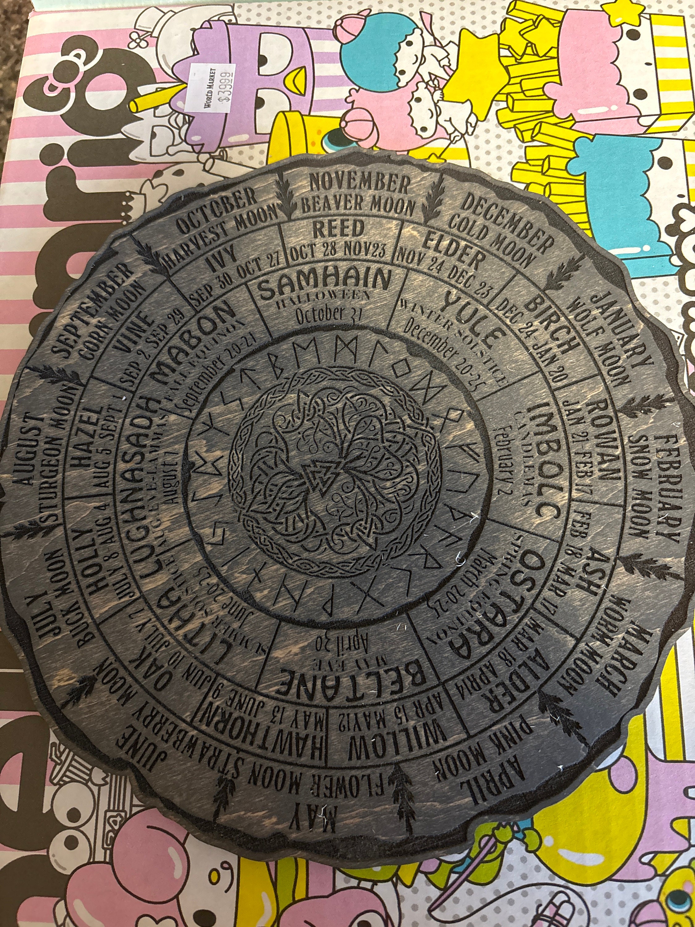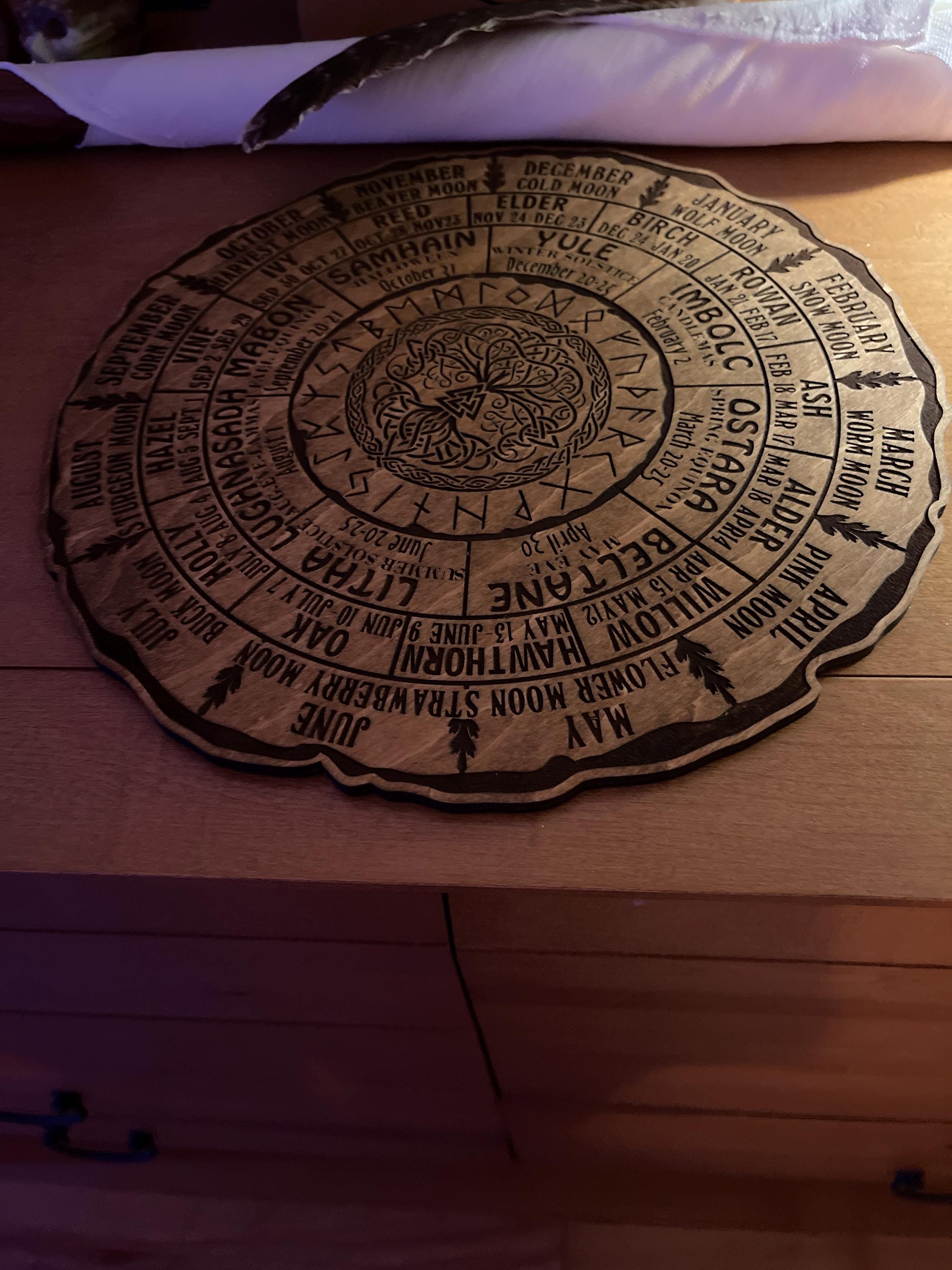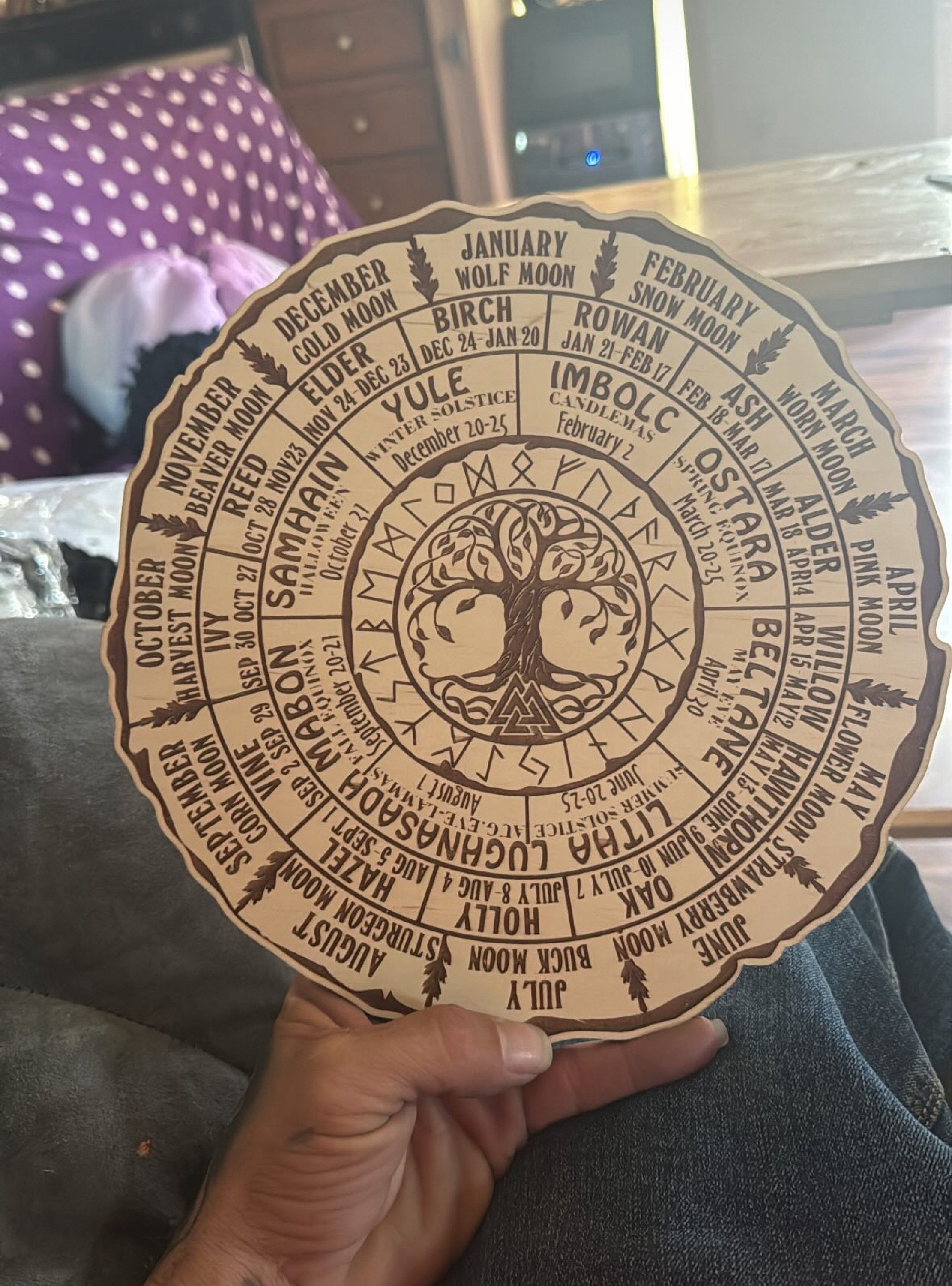 Beautiful laser engraved Wheel of the Year is made of 1/4-inch-thick Birch plywood and comes in different sizes and colors.